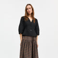 Belville Blazer in 100% merino wool is a cropped collarless jacket and is tailored into a slim fitted silhouette. It has three-quarter length shaped sleeves and is fastened by two hexagonal buttons.