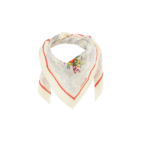 Stort smukt blomstret tørklæde fra Habiba i blødt 100% økologisk bomuld. Måler 80 x 80 cm