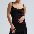Strap top with V-neck and straight cut at the back. Gathering effect at the front. Neckline and armholes have ribbed edges. Rounded bottom with overlocked edge. Made from soft and light merino wool, which has a natural temperature-regulating effect.